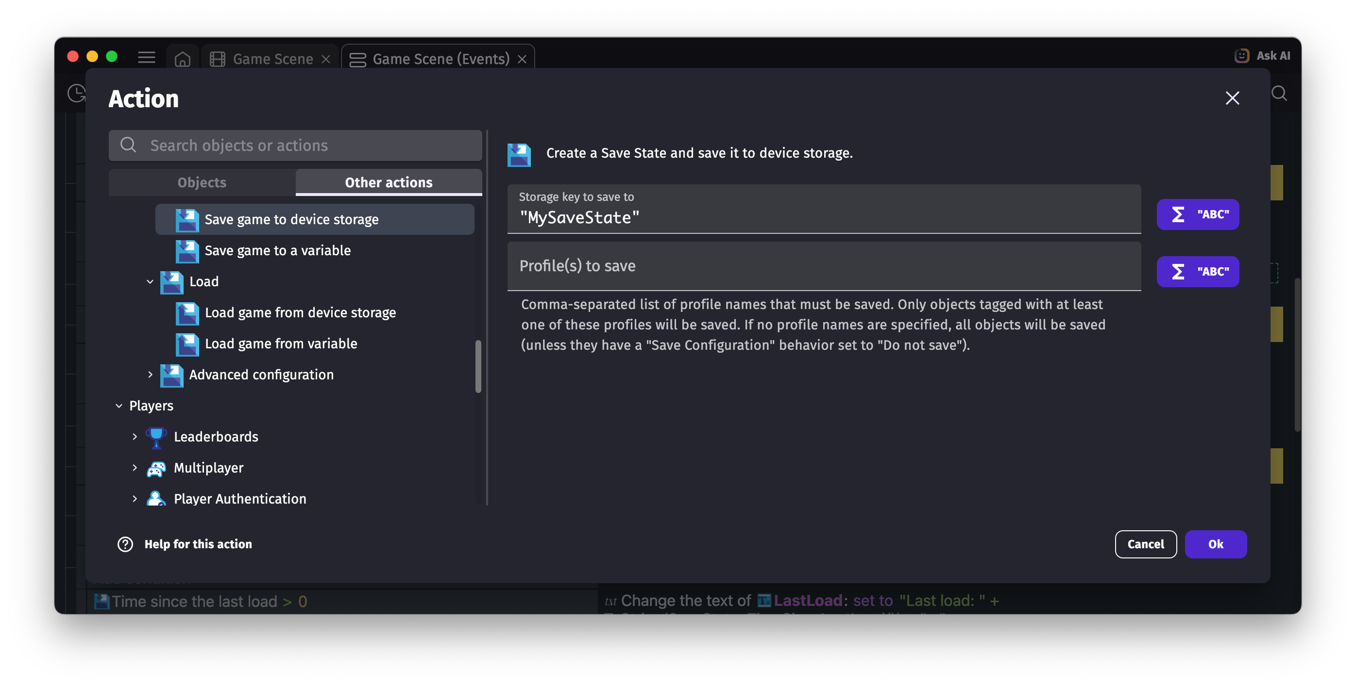 • Load just succeeded / Load just failed: conditions that are true the frame after a load completes. "Load just succeeded" is ideal for running logic right after a scene is restored — unlike "At the beginning of the scene", the scene is already fully started at that point (it was "frozen in time" in the save state).