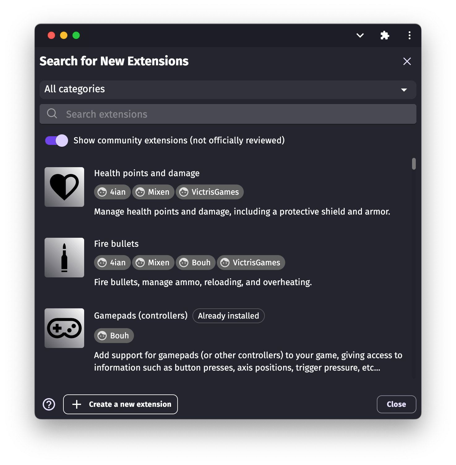 Extensions are presented with their names, followed by a short description. This should give you an idea of what the extension can do in your game.